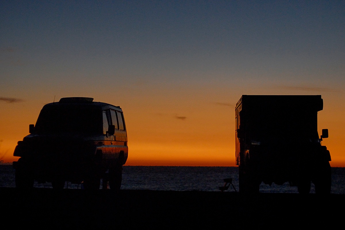 Camp direkt am Strand. Das Restaurant gegenüber hat geöffnet und serviert morgens ein Frühstück und abends die üblichen Leckereien. Wir dürfen die Toiletten benutzen.